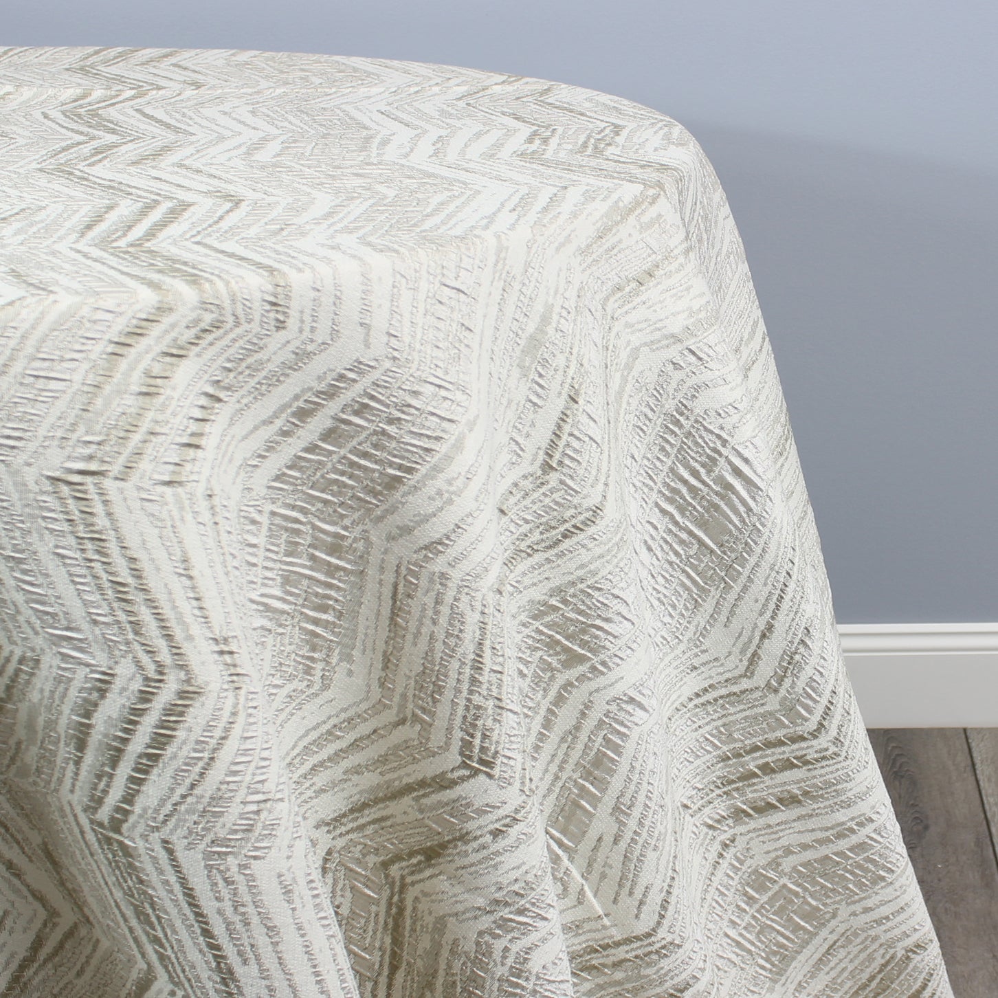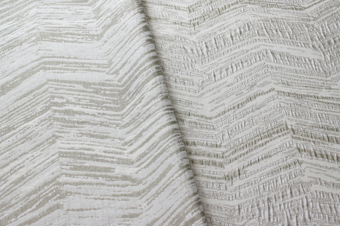 This fabric features a subtle chevron pattern woven into a light-colored base, creating a refined texture with raised lines that enhance its directional design. Ideal for sophisticated upholstery or drapery projects, it offers both visual interest and a tactile dimension, elevating any interior with understated elegance.