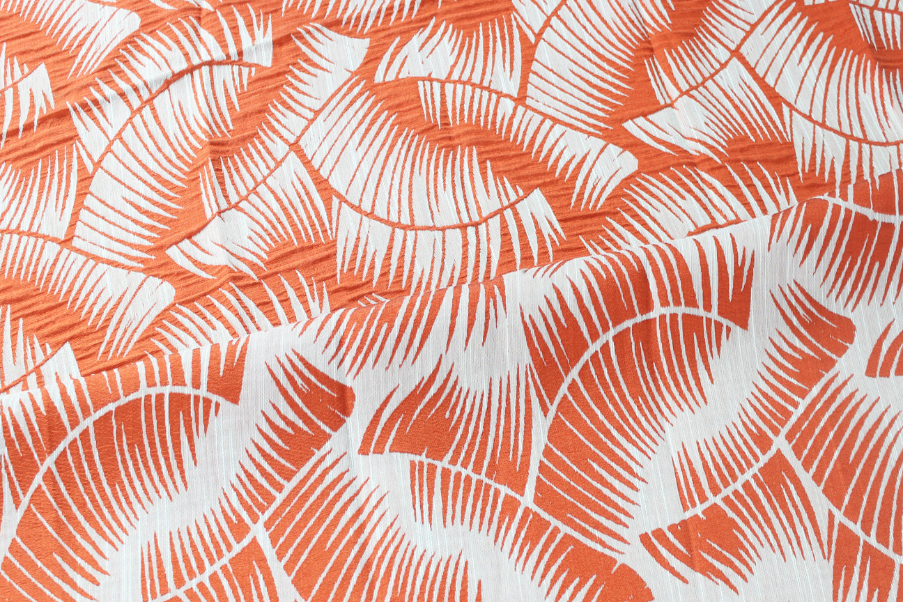 This Fern fabric in a refined orange hue features a subtle sheen that enhances its elegant appearance. Its distinctive horizontal slubs and natural wrinkles add texture and depth, making it an excellent choice for sophisticated upholstery, drapery, or decorative projects that demand both style and character.