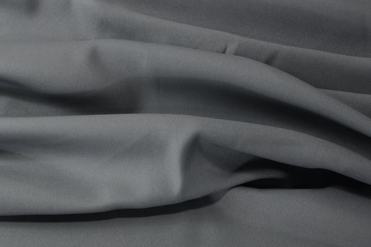 This grey colored Polyester Poplin fabric features a smooth, tightly woven texture with a matte finish and minimal sheen. Its noticeable crispness and structured feel make it ideal for tailored garments and projects requiring clean lines and durability.