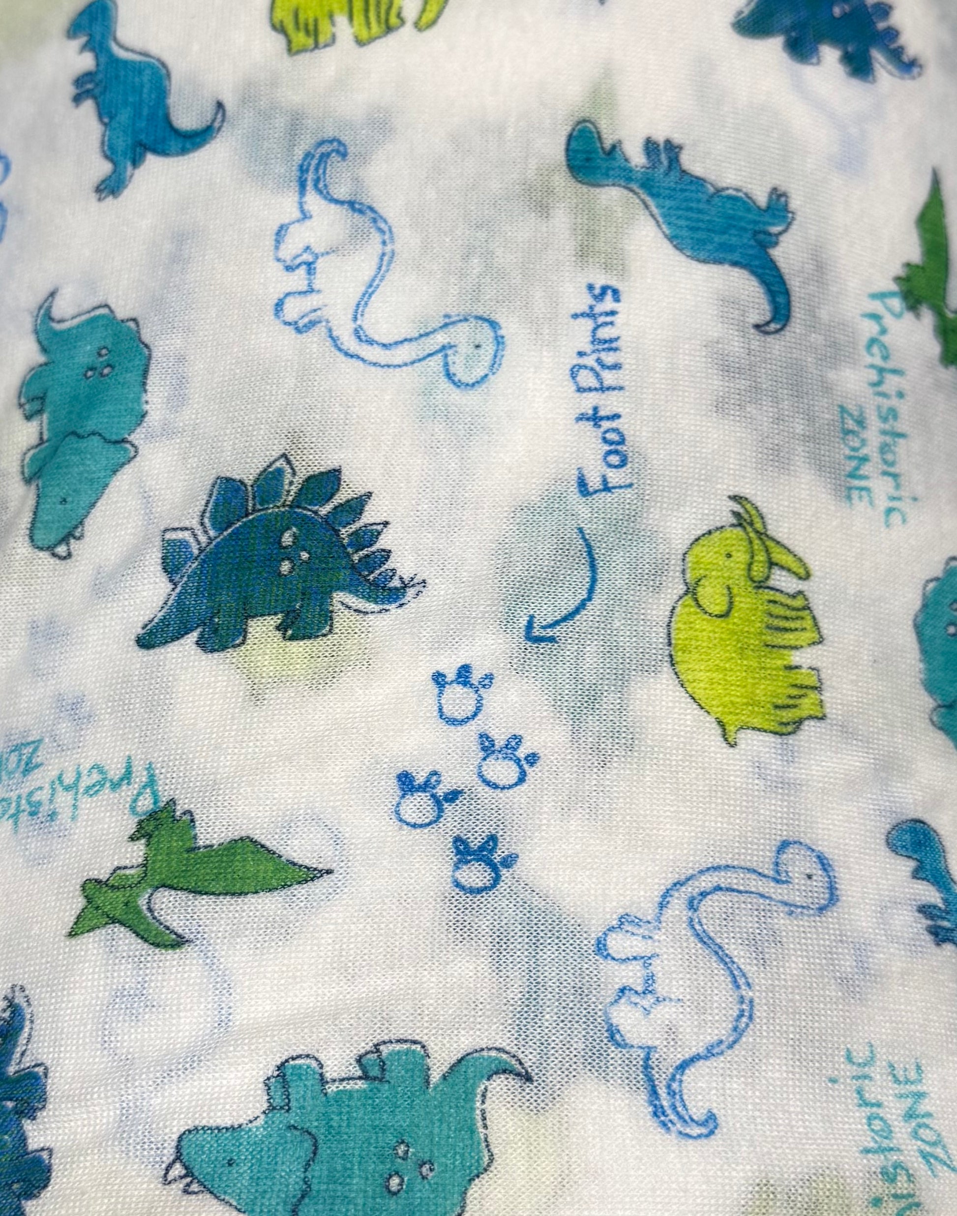This fabric features a playful dinosaur print in blue, green, and yellow on a crisp white background, accented with footprints and "prehistoric zone" text. Crafted from a light and soft knit material, it offers comfortable wearability and easy draping, ideal for creating children's apparel or themed projects that require both style and comfort.