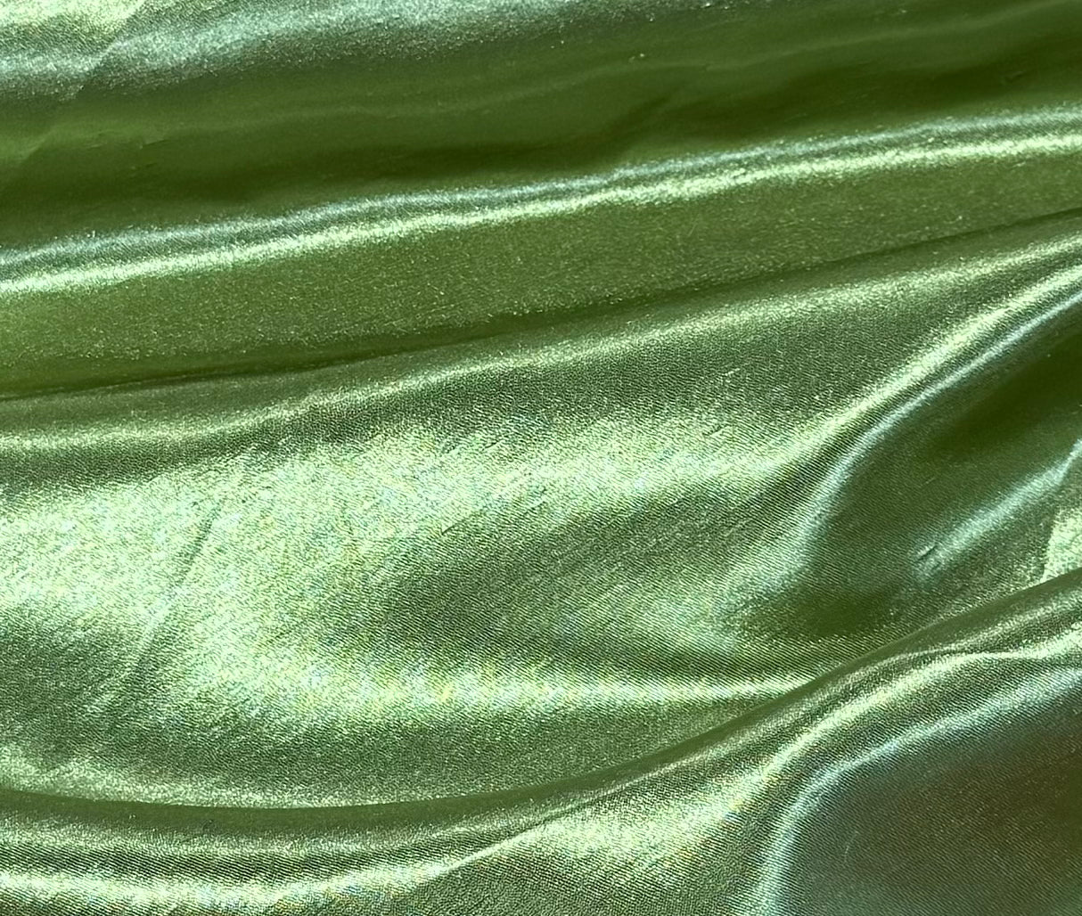 This dark lime shantung satin fabric features a smooth surface with a slightly matte finish complemented by a soft sheen. Its refined texture offers subtle elegance, making it ideal for sophisticated garments and projects that require a delicate balance of luster and understated charm.