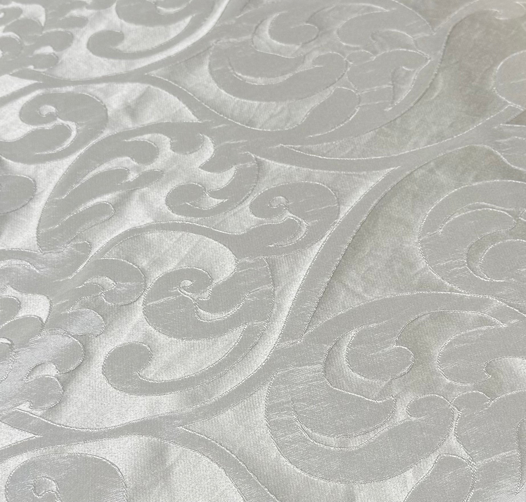 Our Victorian Damask fabric in Ivory showcases an ornate scroll pattern crafted through a raised jacquard weave. The design contrasts matte and lustrous textures, creating a sophisticated interplay of light and depth. Perfect for elegant upholstery, drapery, or decorative accents, this fabric combines classic style with expert weaving techniques for a refined, timeless look.
